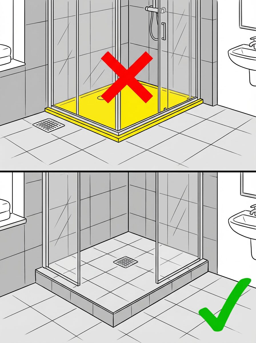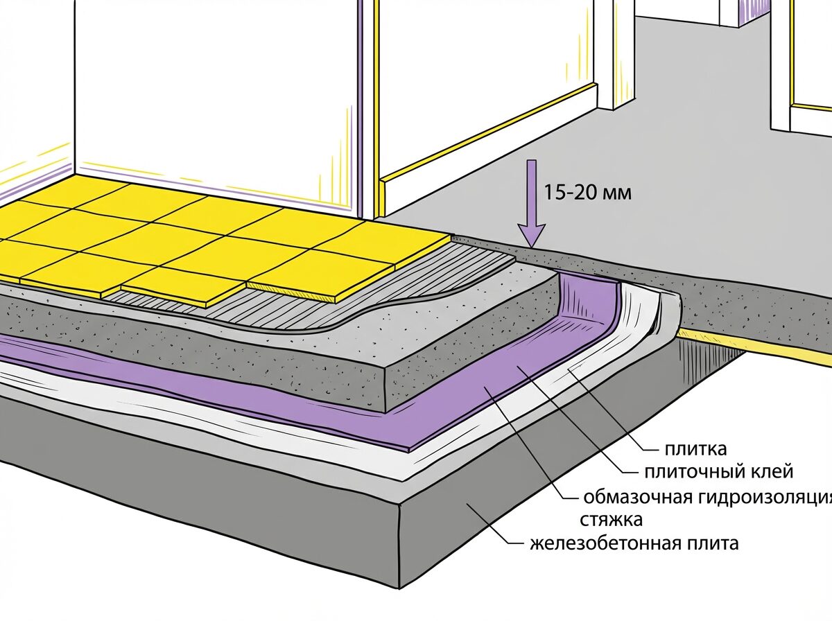 Чтобы инспектор принял работу, «пирог» подиума должен быть грамотным. Нельзя просто налить бетон. Правильная схема: Плита → Звукоизоляция → Гидроизоляция №1 → Облегченный наполнитель (керамзит) → Стяжка → Гидроизоляция №2 → Плитка. Душевой поддон из плитки на подиуме не нарушает целостность несущих конструкций.