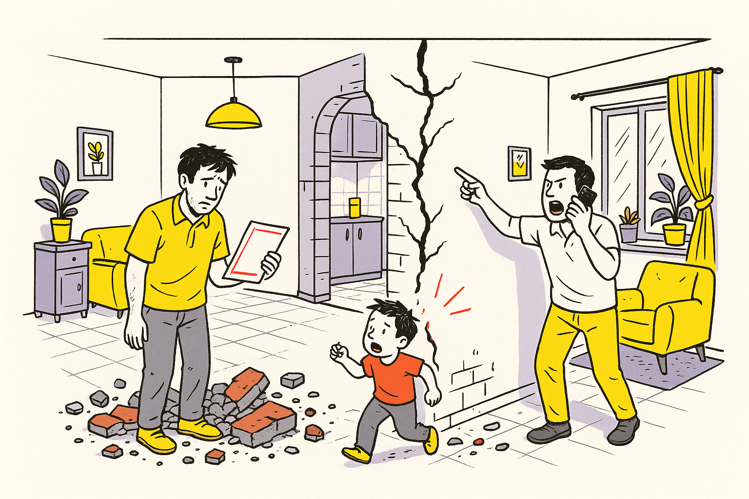 - Риск для безопасности всего дома. Самовольный проем в несущей стене может привести к трещинам и обрушению. Ответственность, в том числе уголовная, — на вас. Соседи могут подать коллективную жалобу в прокуратуру.